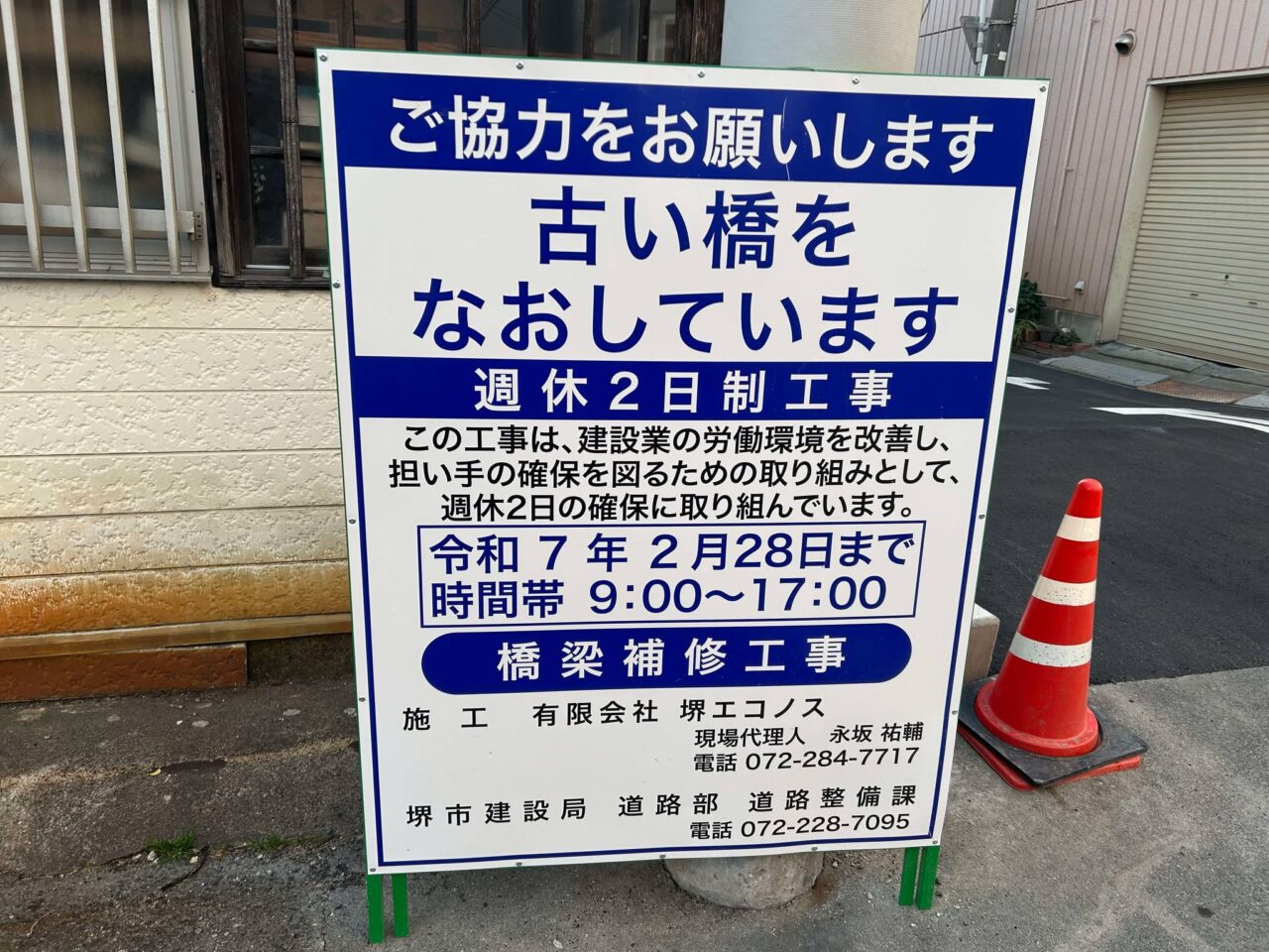 【堺市堺区】府道30号線一条通南交差点からすぐの四条通にある小さな古い橋の補修工事が行われています。