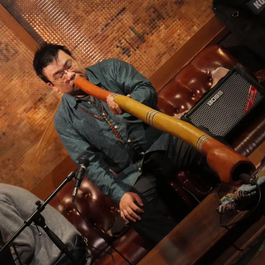 そして世界の楽器体験では、世界各国から取り寄せた珍しい楽器を体験できます。写真は『第1回癒しと健康のサロン』主催者の1人、小間物谷良平さんがディジュリドゥを演奏する様子です。ディジュリドゥはオーストラリアの先住民アボリジニが使い始めたといわれている楽器です。