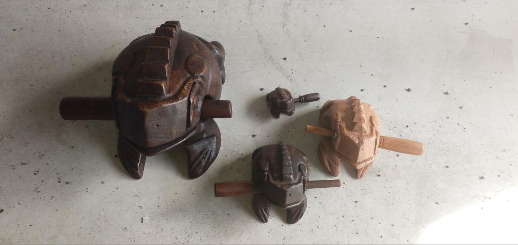 取っ手を持って動かすと、カエルの鳴き声がする楽器だそうです。しかもカエルの形をしています。