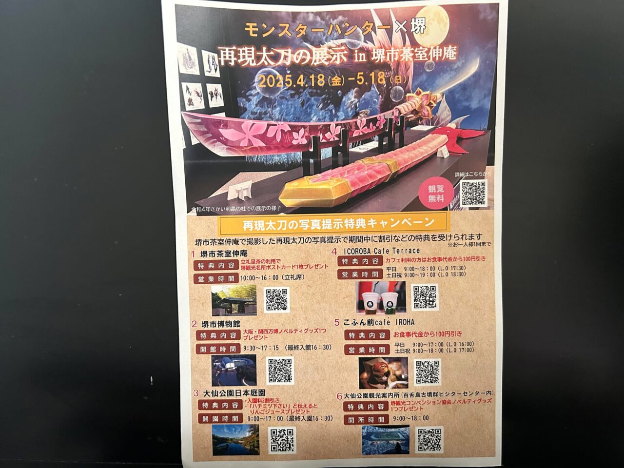 【堺市堺区】JR阪和線百舌鳥駅からすぐの大仙公園内にある茶室伸庵で2025年4月18日(金)から5月18日(日)まで『モンスターハンター×堺 再現太刀の展示in堺市茶室伸庵』が開催されます!