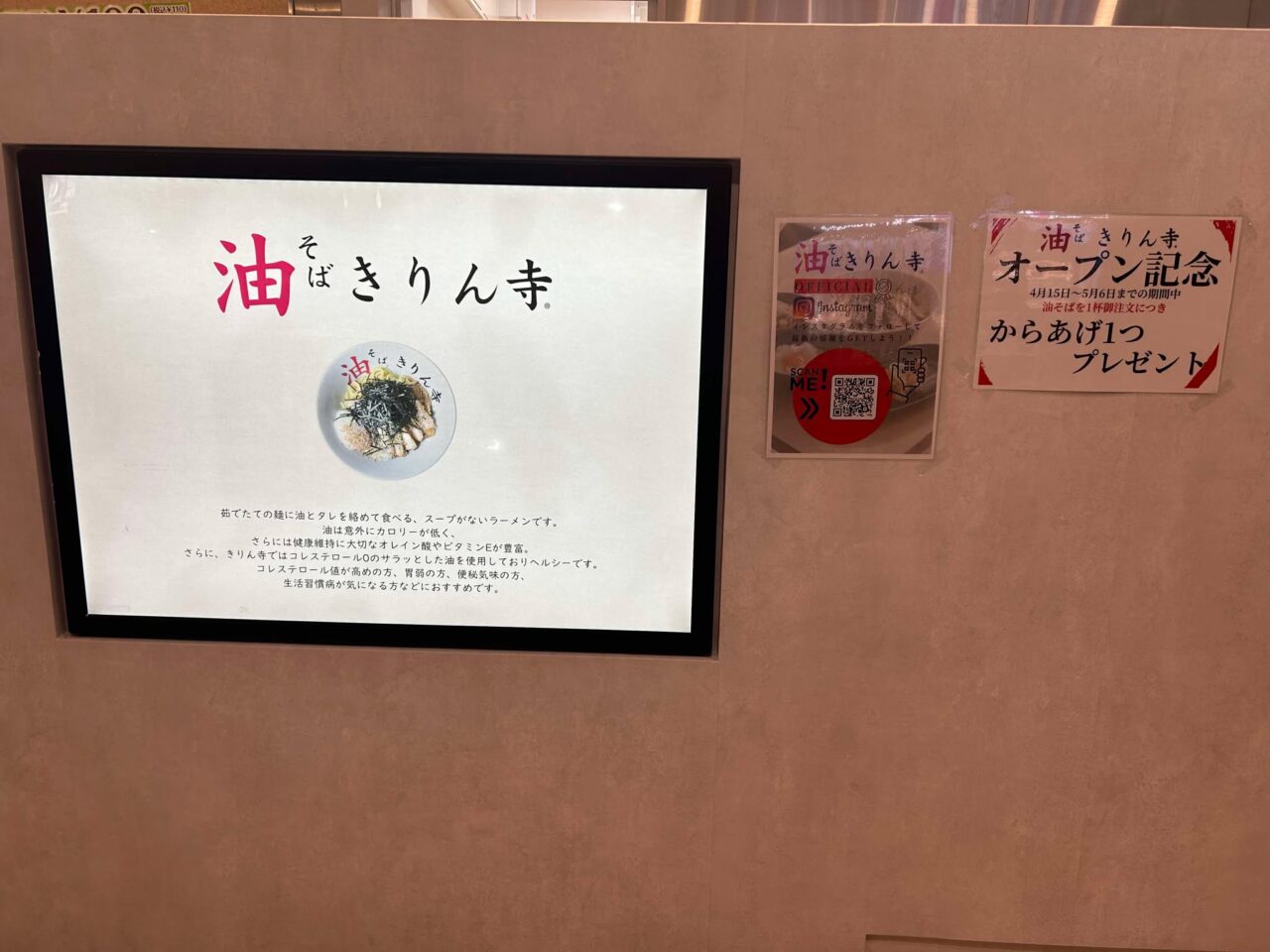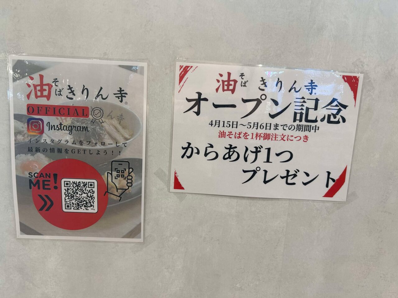 グランドオープンを記念して、2025年4月15日(火)から5月6日(火)までの期間中に油そばを1杯注文につきからあげ1つプレゼントになっています。
