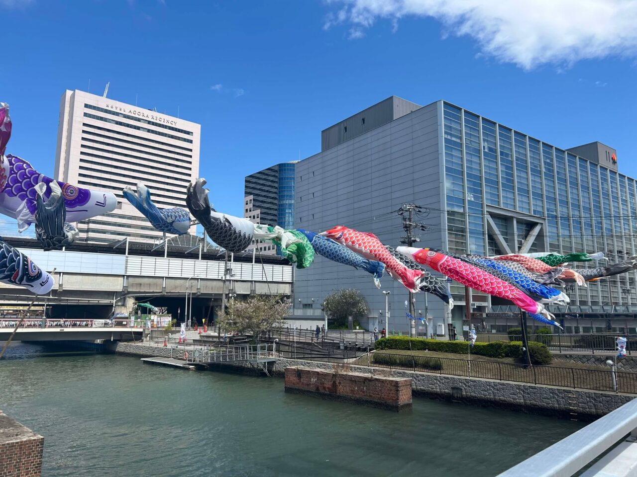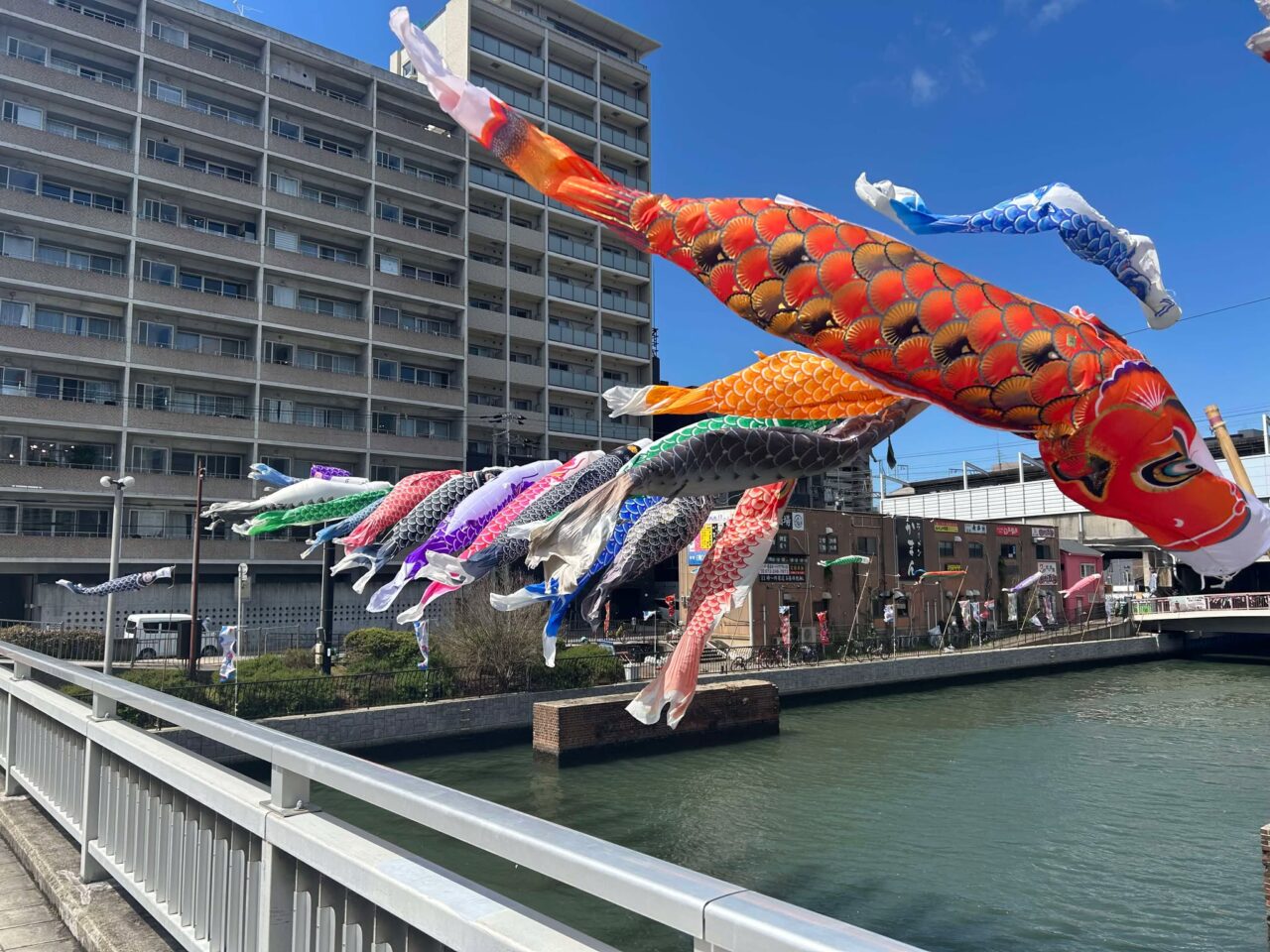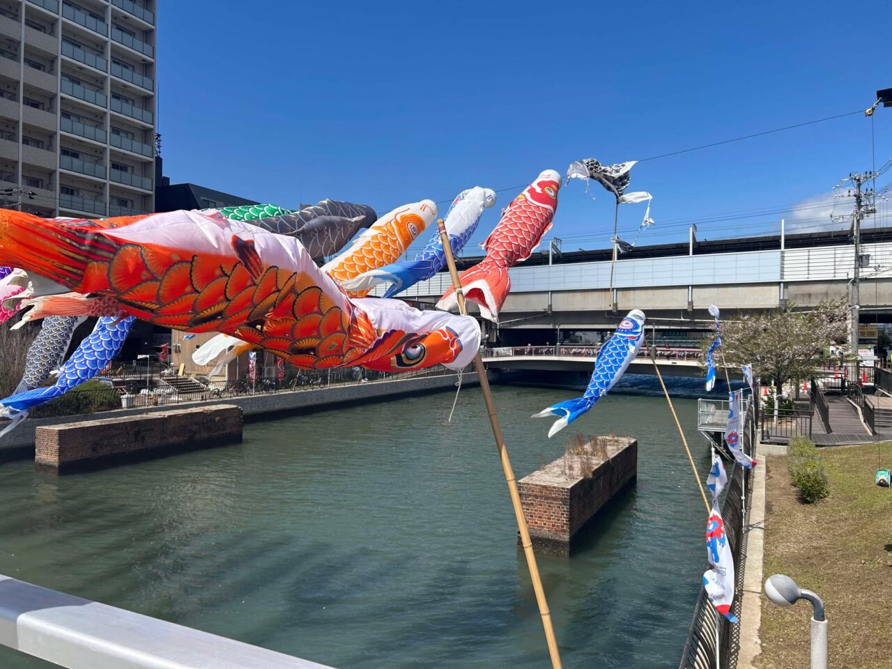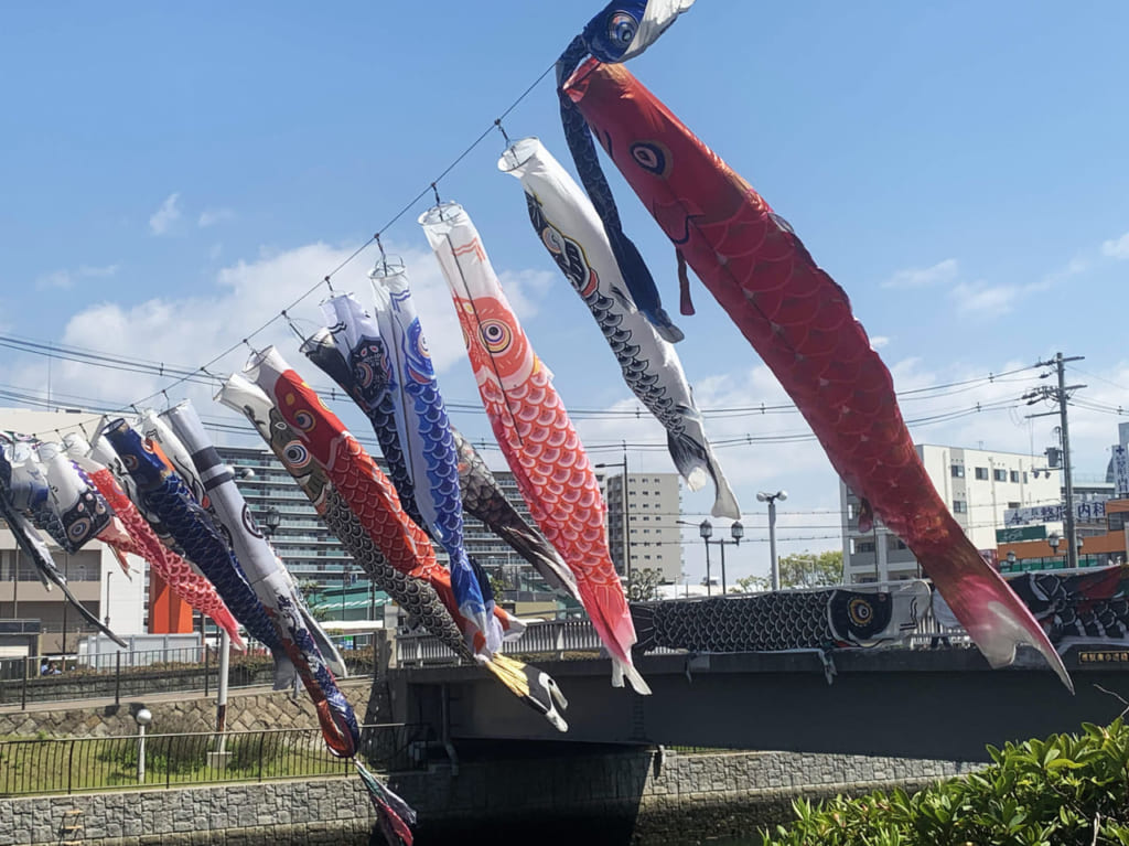 旧堺港から流れてくる風に煽られて、鯉のぼりは元気に泳いでいます。