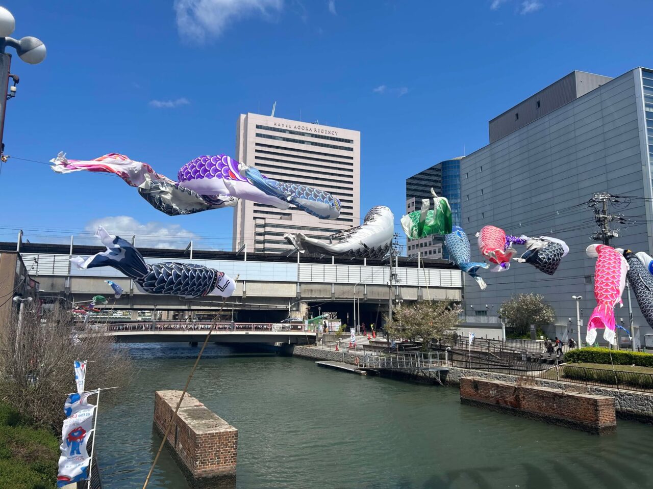 【堺市堺区】南海本線堺駅からすぐの堺駅南歩道橋に鯉のぼりが取り付けられました。