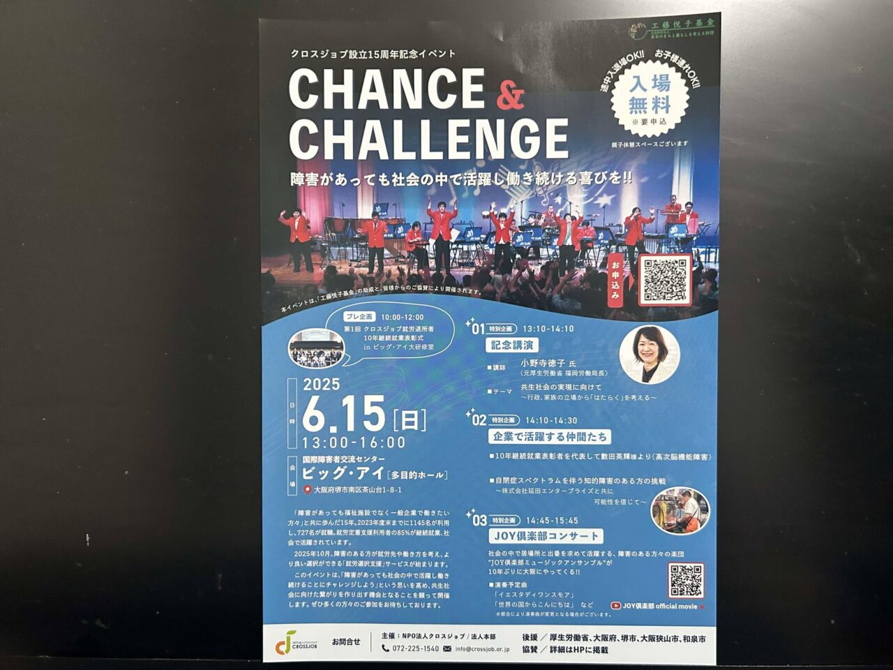 クロスジョブ設立15周年記念イベント「CHANCE&CHALLENGE」は2025年6月15日(日)に国際障害者交流センタービッグ・アイの多目的ホールで開催されます。