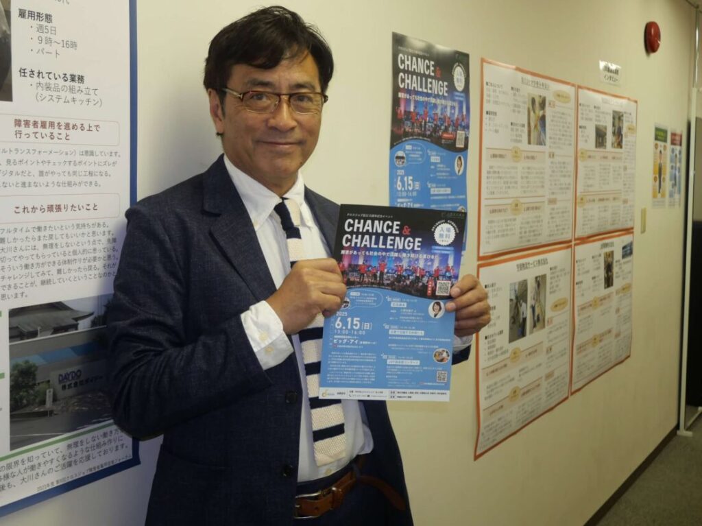 クロスジョブ鳳の徳谷支援員も笑顔でチラシを見せて、このイベントを通して一人でも多くの方に、障害があっても社会の中で活躍し働き続ける喜びを感じて欲しいと意気込んでいました。