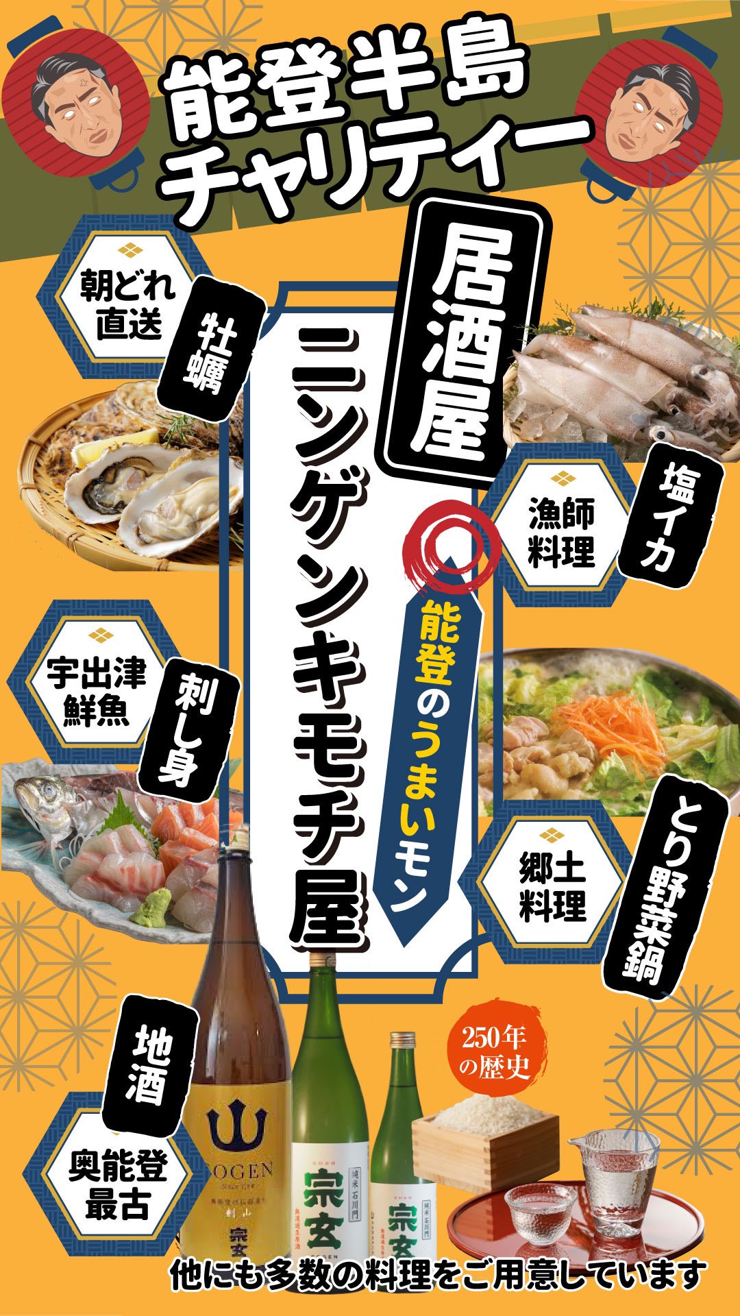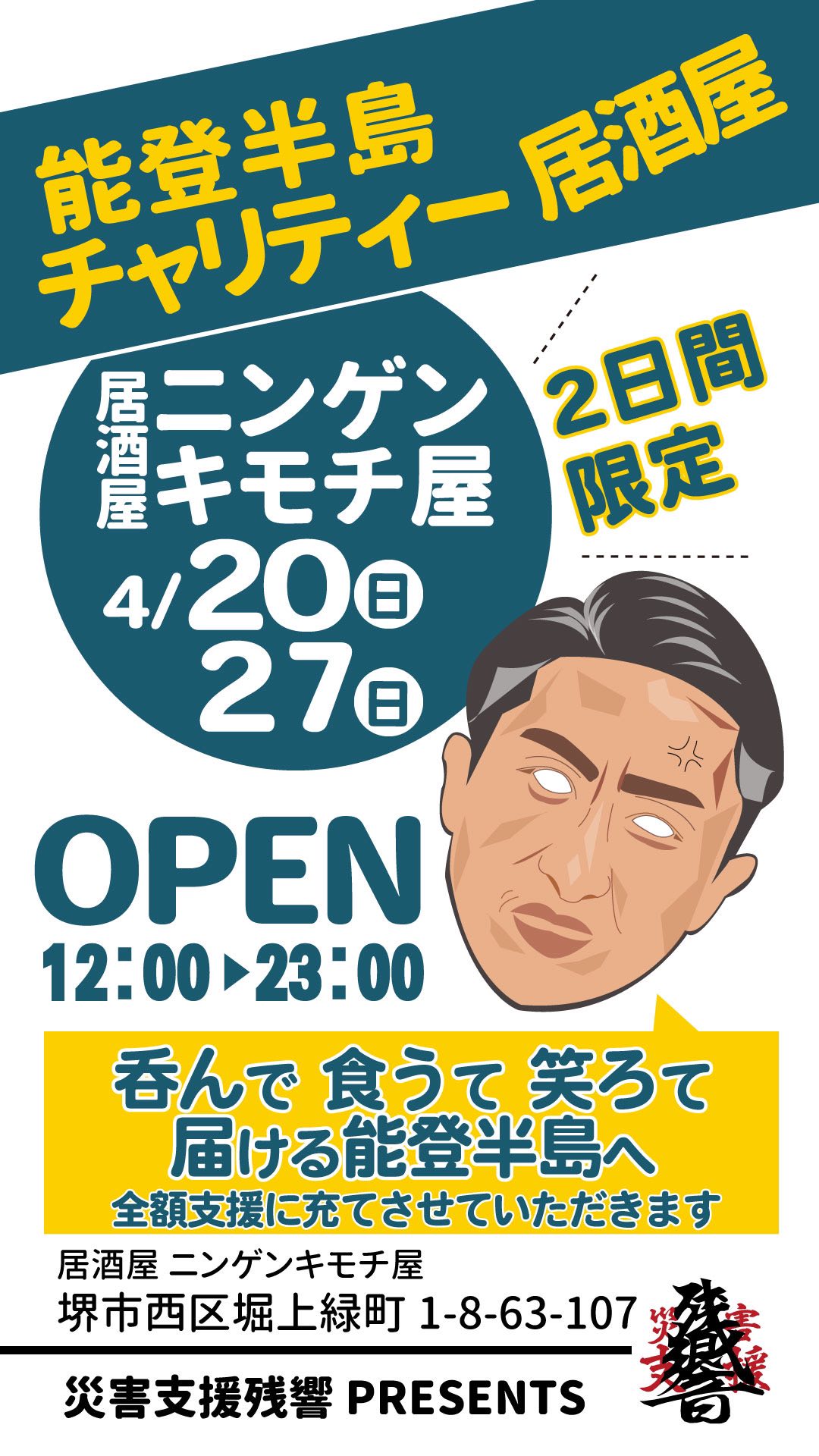 能登半島チャリティー居酒屋『居酒屋ニンゲンキモチ屋』が開催される粉もん屋enはこちら↓