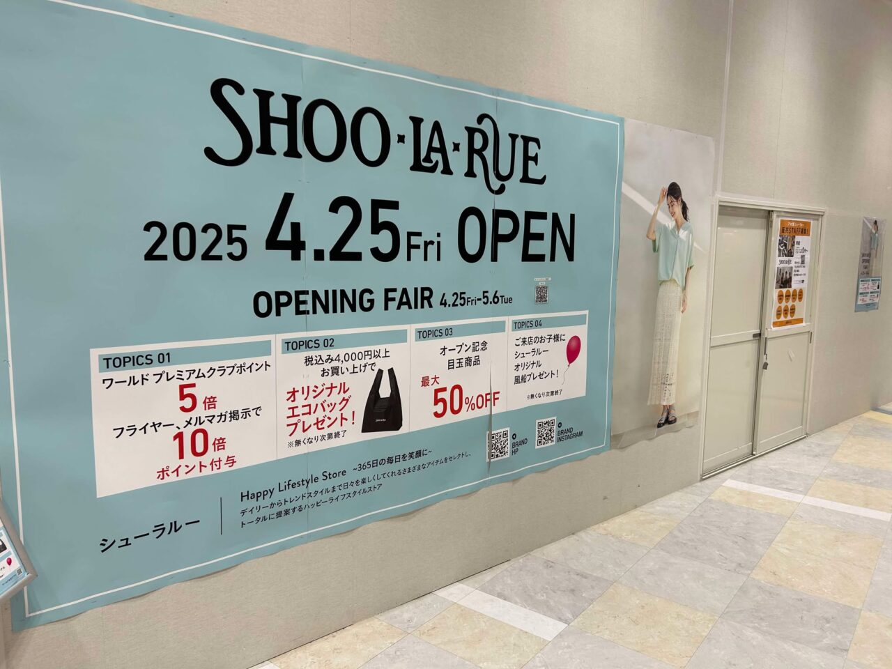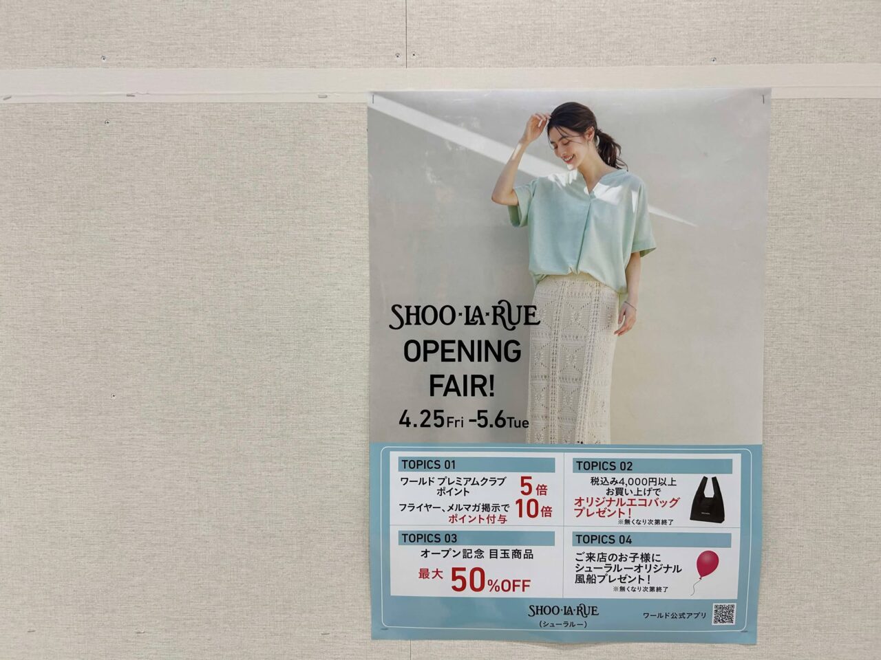 SHOO・LA・RUE(シューラルー)のオープンを記念して4月25日(金)から5月6日(火)までオープニングフェアーが開催されます。