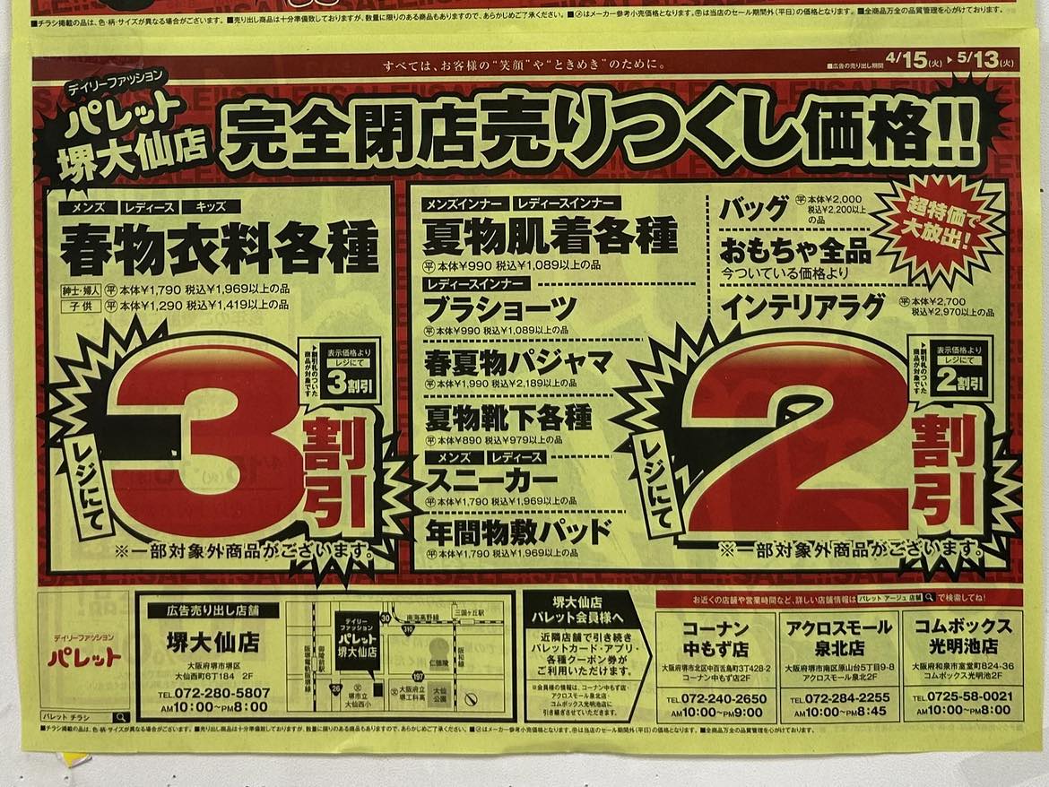 府道30号線沿い御陵通交差点から歩いて約3分の場所にあります『デイリーファッションパレット堺大仙店』が2025年6月15日(日)に完全閉店することになり、4月15日(火)10:00から閉店売りつくしが行われています。