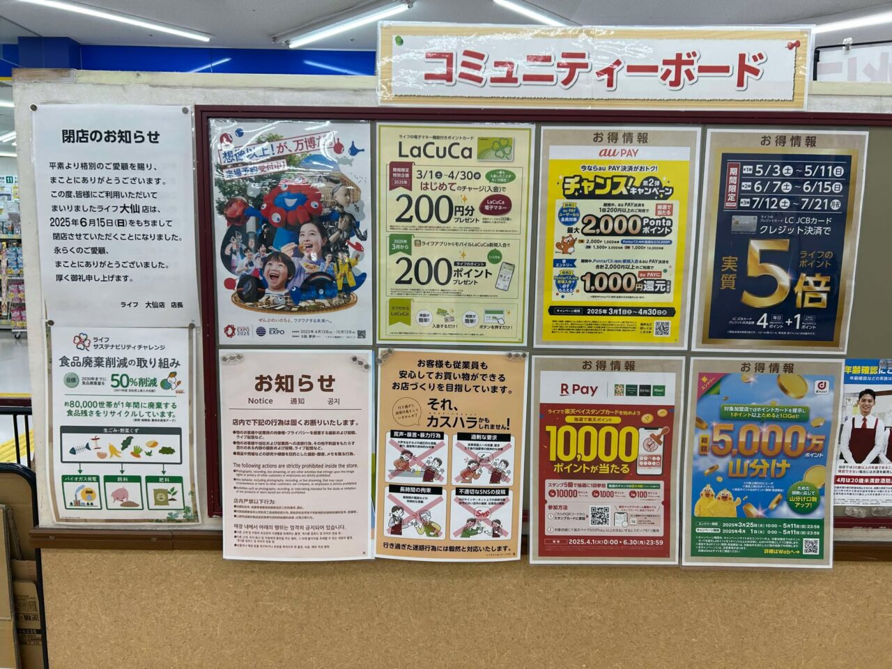 ライフ大仙店は正月の三が日を除き毎日営業していたお店で、朝の9時から22時まで営業していましたので、お世話になった方は大勢のはず。コミュニティーボードにお知らせやお得情報が掲載されています。ポイント利用などで気になる事がある方はライフ大仙店のお店で確認するようにお願いいたします。