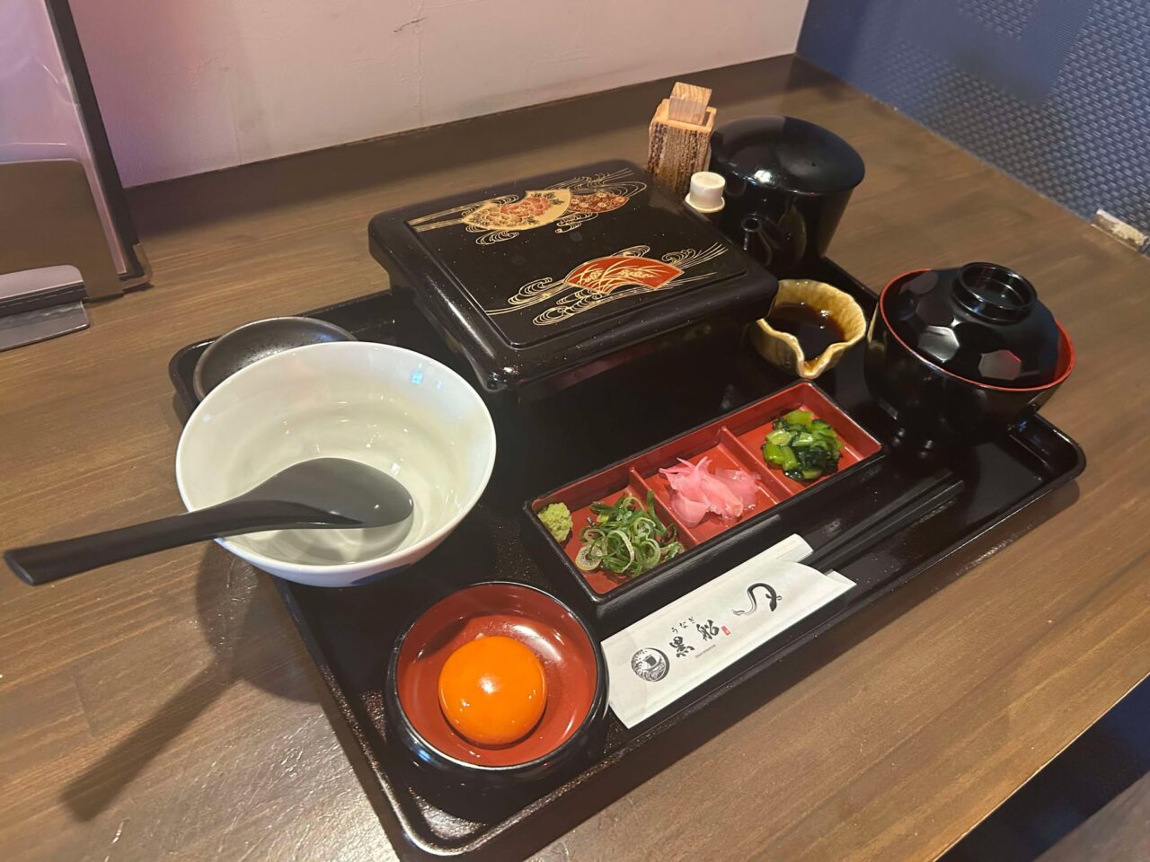 こだわり卵を和牛鰻ひつまの上に乗せます。山椒に岩塩、たれもありますので、お好みの食べ方で楽しめます。