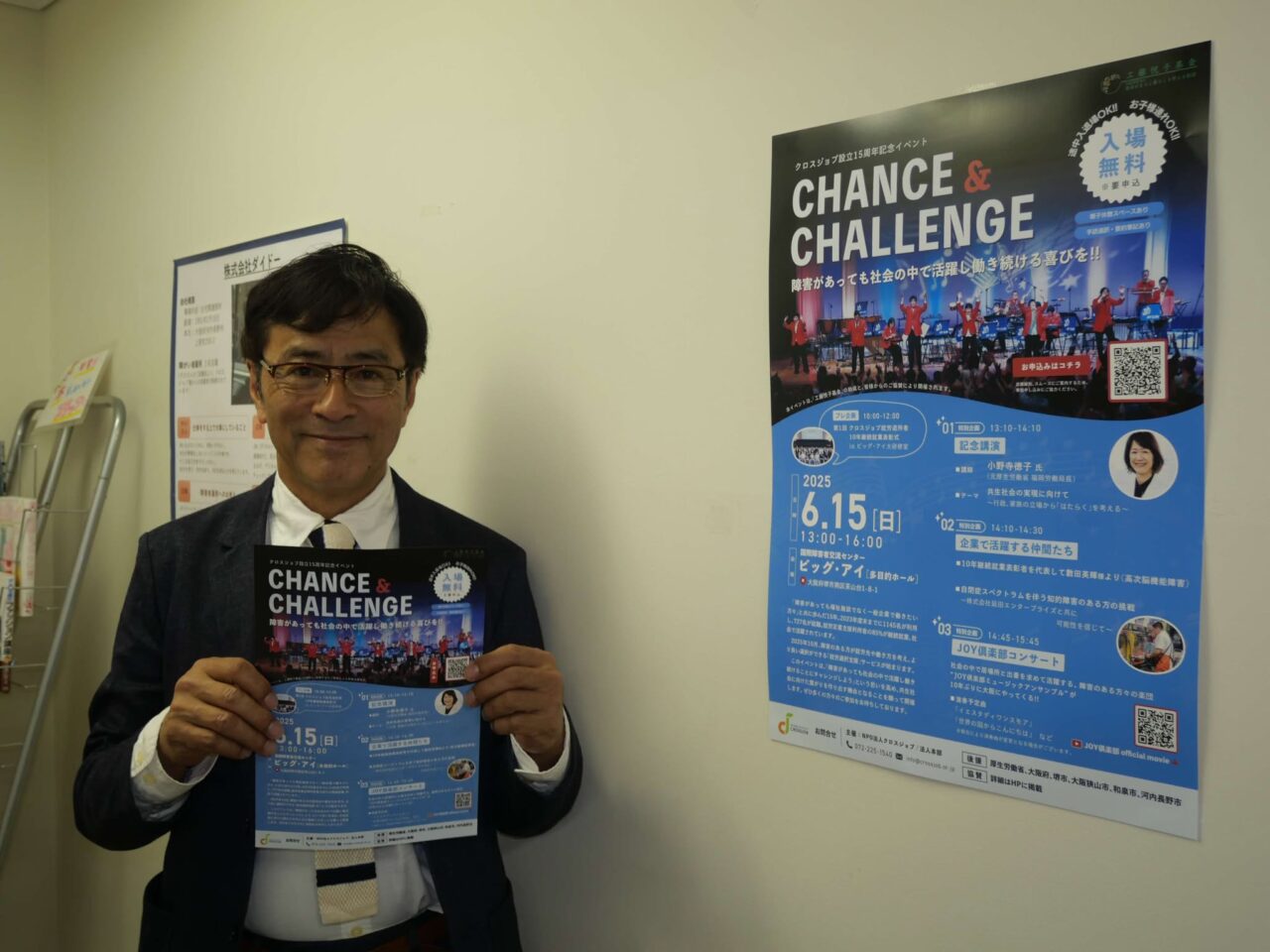 NPO法人クロスジョブの発祥の地は堺で、2025年5月現在では全国に8カ所もあり、この活動を地道に継続した結果、15周年を迎える事になりました。そこで、クロスジョブ15周年記念行事「CHANCE&CHALLENGE」を2025年6月15日(日)に堺市南区の国際障害者交流センタービッグ・アイの多目的ホールで開催します。