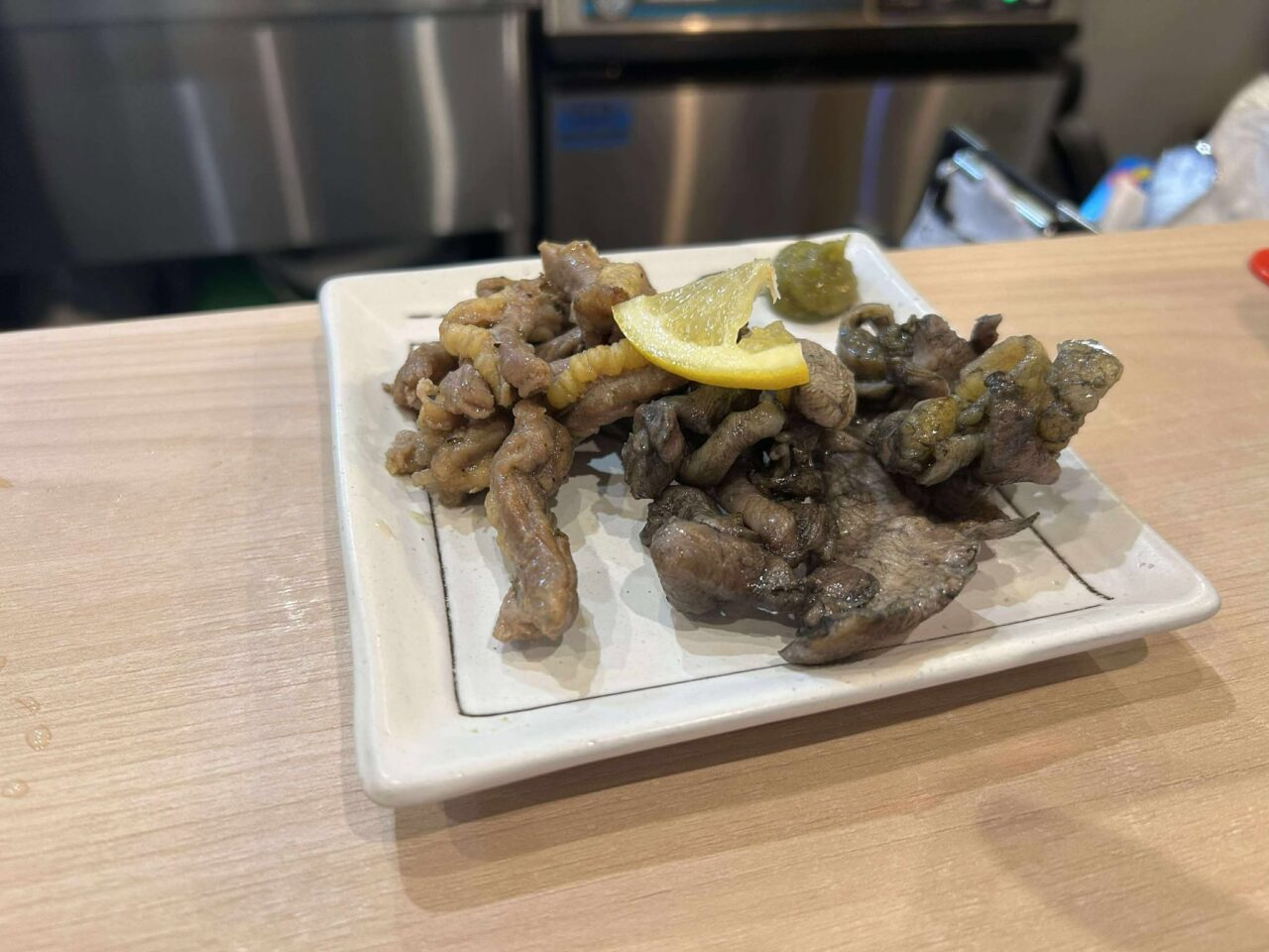 焼きもの2種盛り(750円税込)は、鶏の炭火焼とセセリの塩焼きです。どちらもしっかりした歯ごたえで美味しかったです。