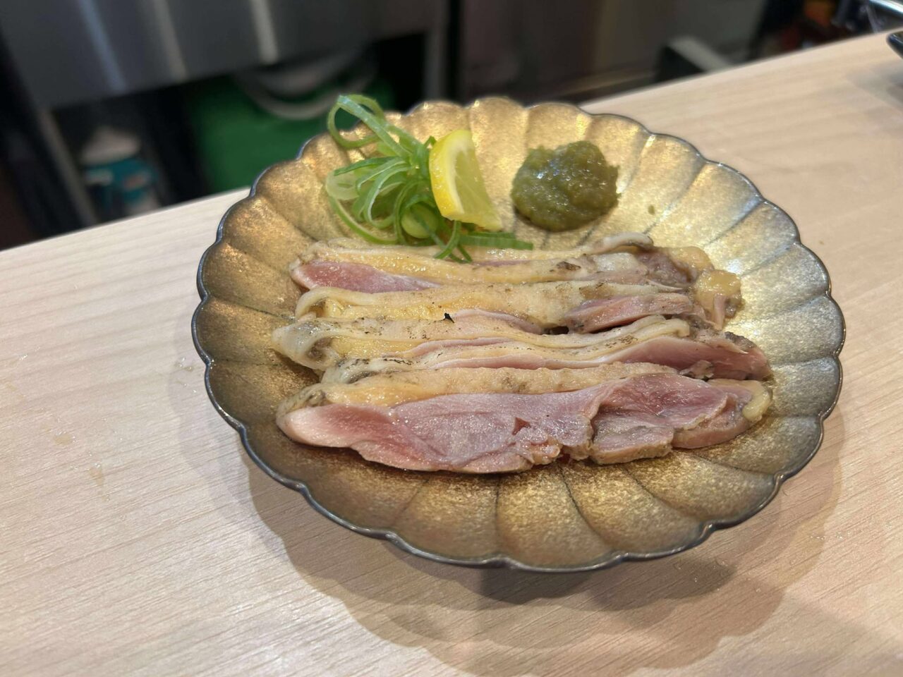 たたき三種盛り(800円税込)はこちらになります。ムネ、モモ、ササミで、食感や味の違いが楽しめます。