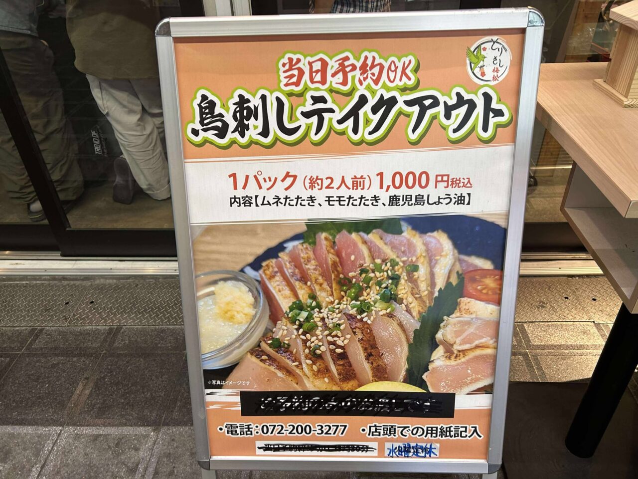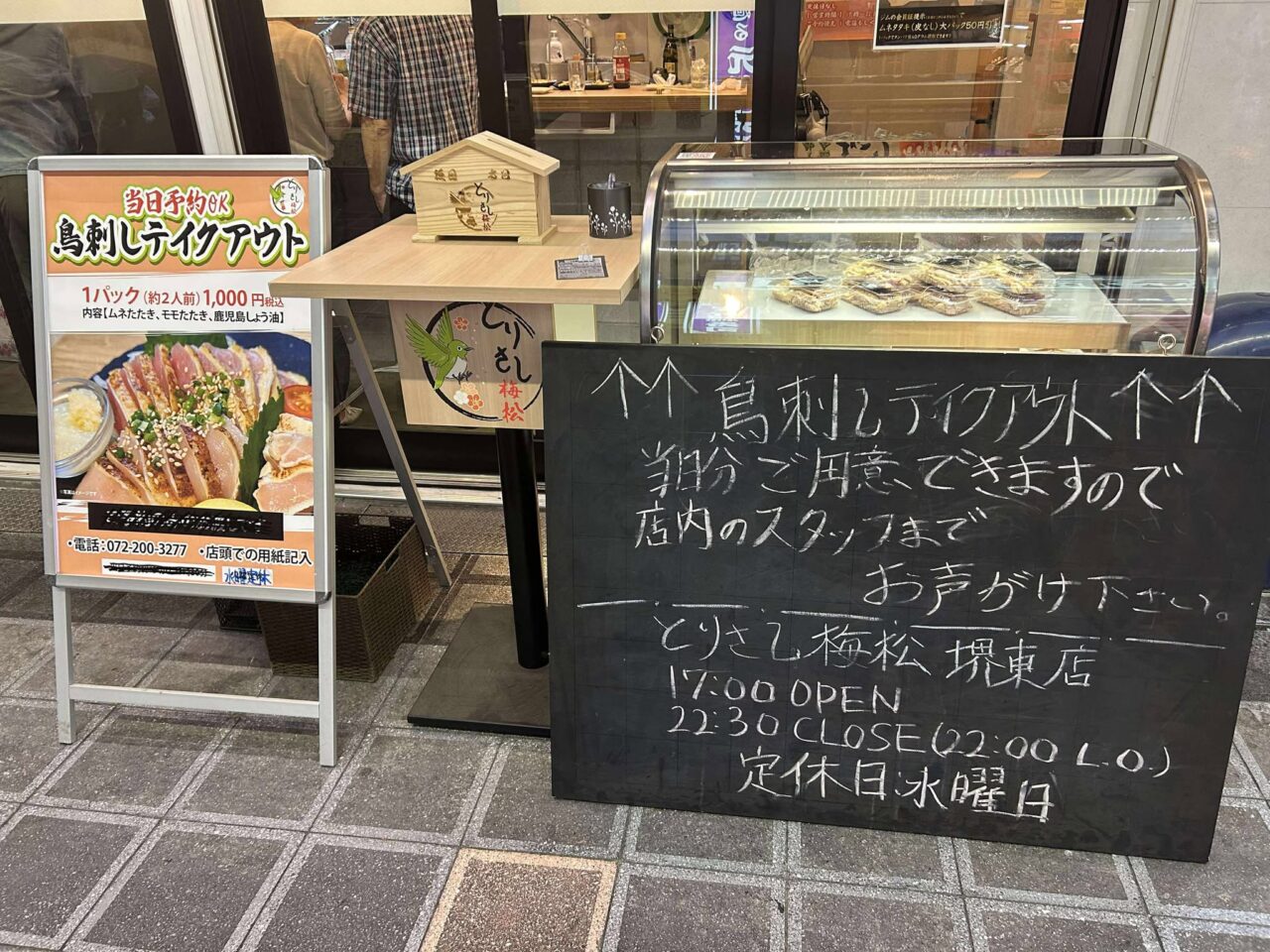 店前では鳥刺しテイクアウトの商品が並べられています。お店の営業時間や定休日が書かれているのもありがたいですね。