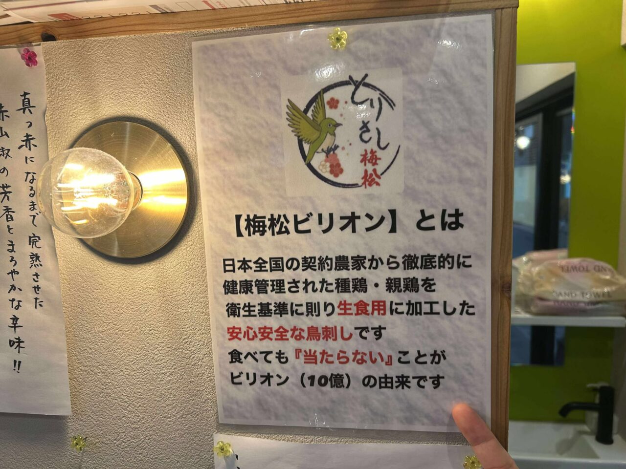 南海高野線堺東駅西口から歩いて約3分の場所にある『とりさし梅松 堺東店』では新鮮な鳥刺し料理が楽しめます。看板のセンスの良さが目立ちますね。
