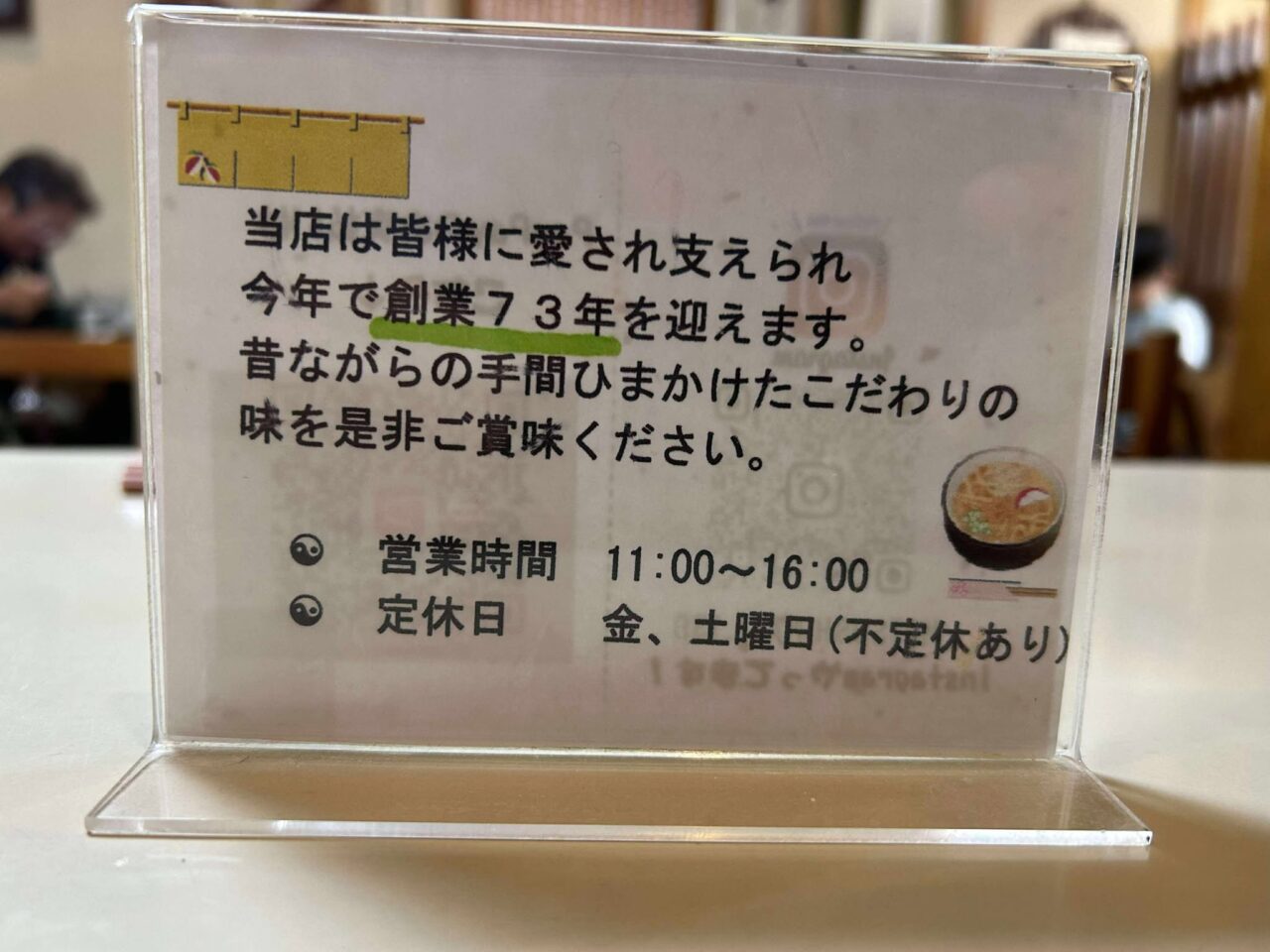 テーブルにはお店からのお知らせがありました。「昔ながらの手間ひまかけたこだわりの味」に期待しちゃいます。