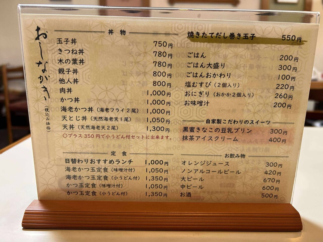 お品書きは丼物、定食、ごはん、自家製こだわりのスイーツ、お飲み物があります。焼き立てだし巻き玉子とスイーツは自慢の逸品なのでしょうか?表記が一味違いますね。