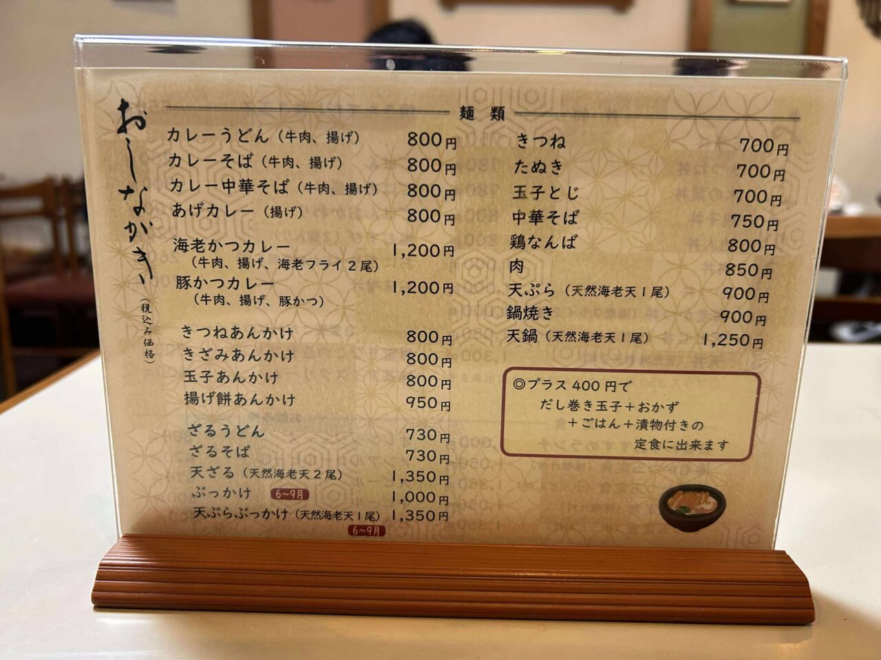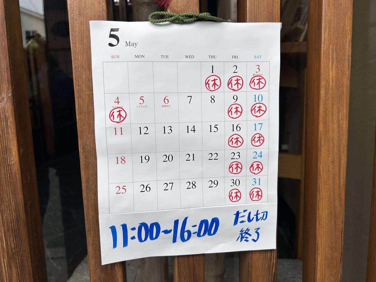 店先に月間予定が貼り出されています。このような気心使いが老舗たる所以でしょうか。だしにこだわるお店ですので、だしが切れたら終了となりますのでご注意ください。