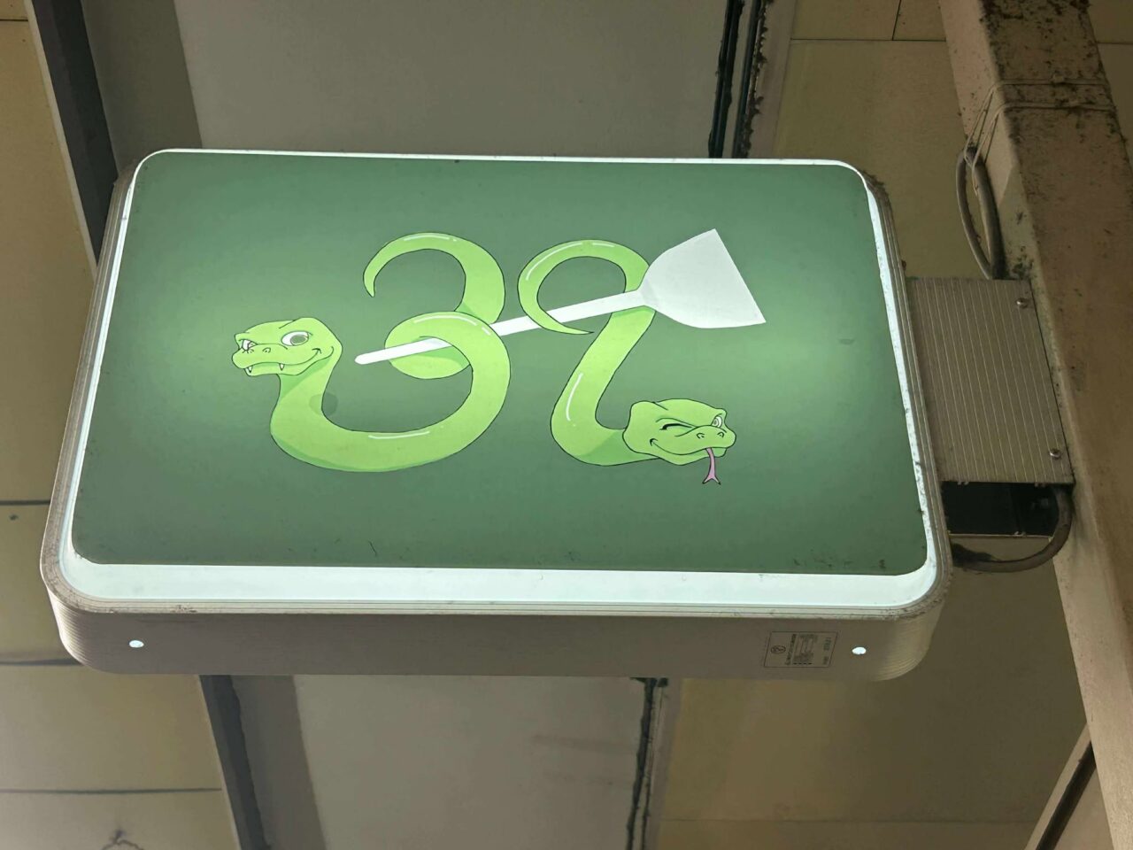 お店の看板はこちら。蛇がヘラに巻き付いて3と9の形をしています。とても縁起の良いお店かもしれませんね。気になった方は足を運んでみてくださいね。
