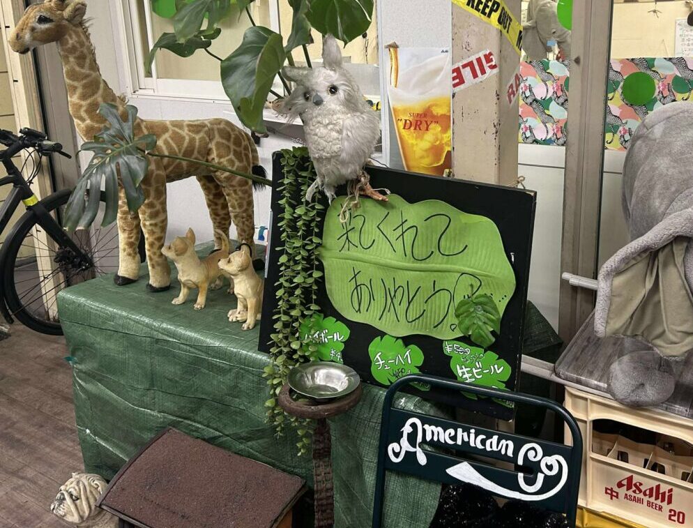 お店の前には屋号の通り感謝が掲示されています。動物の人形も可愛いですね。