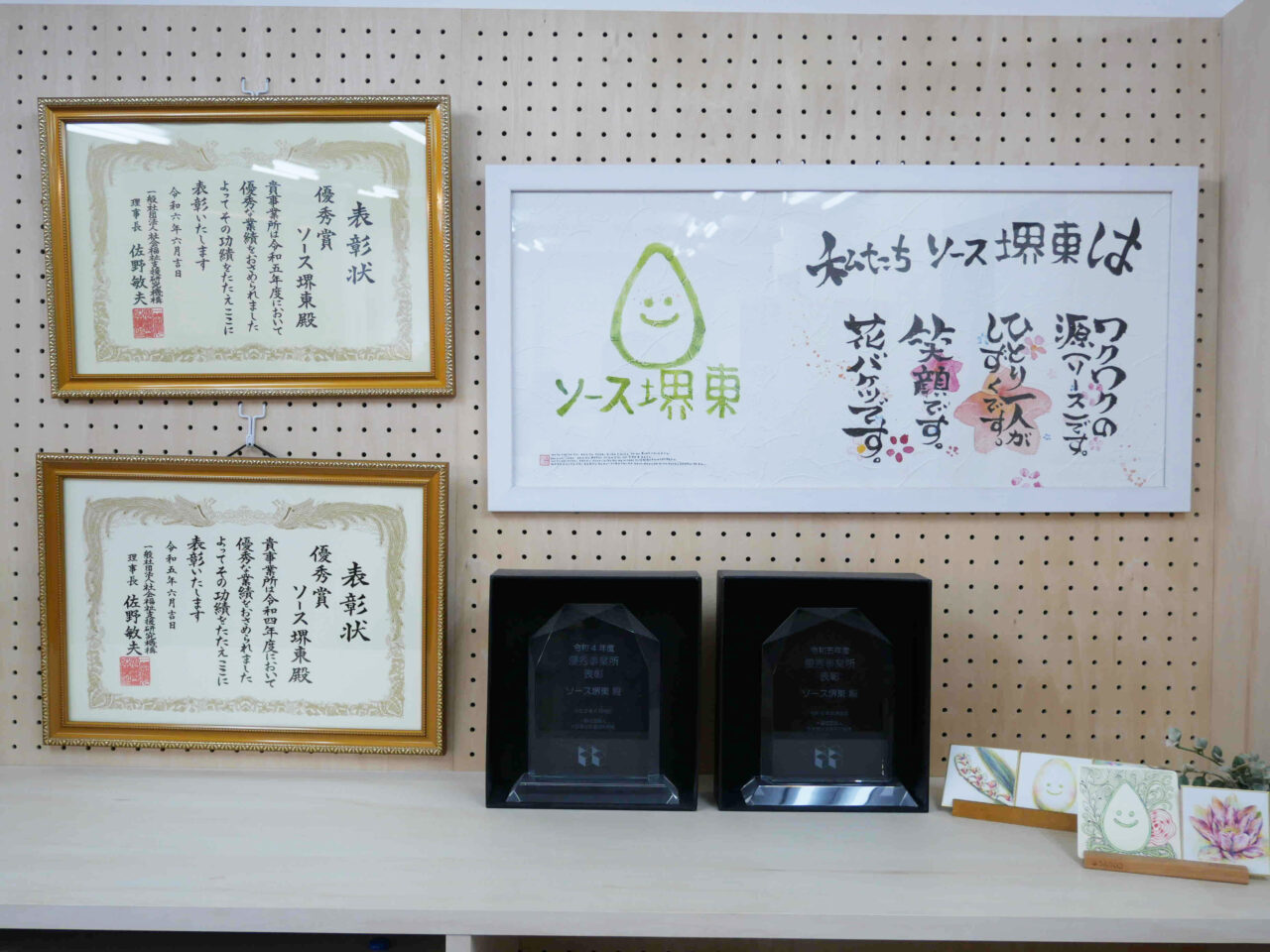 ソース堺東のスローガンや数々の表彰状、記念品が棚に飾られていました。これまでの就労への実績が示されています。