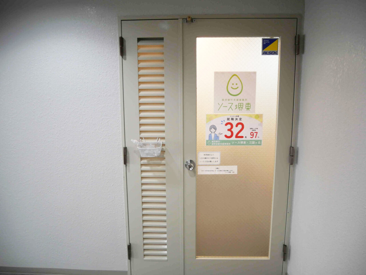 事業所の扉には2024年度の就職決定者の数が記されていました。32名の方がソース堺東と姉妹店のソース三国ヶ丘で訓練して就職し、後半年経った時点でも継続して働き続けている方が97%もいます。