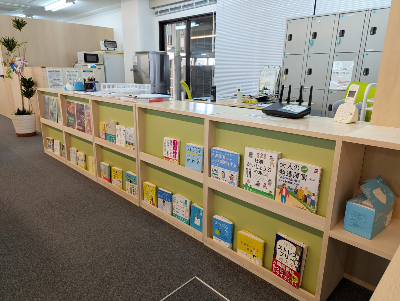 扉を開けるとソース堺東のロゴがお出迎え。ニコッとした笑顔が印象的ですね。働く、働き続けるために必要な知識を様々な角度から知ってもらえるように書籍がいつでも読めるようになっています。