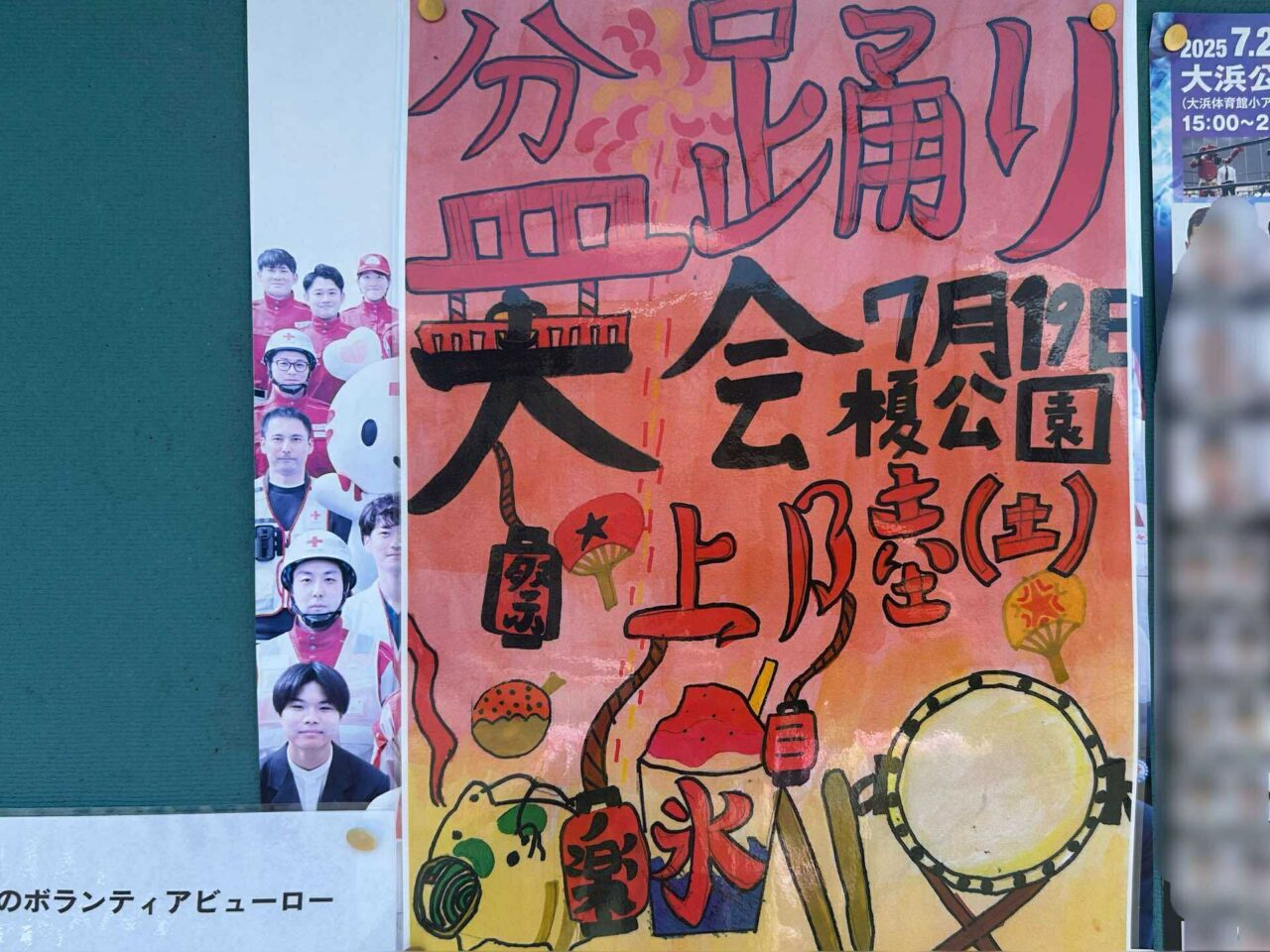 今回は、地域のお子さんが書いてくださったチラシを使用しており、手書きの良さが感じられるチラシになっています。他のチラシも見てみたいので、掲示板を見かけたら盆踊りのチラシを探してしまいますね。