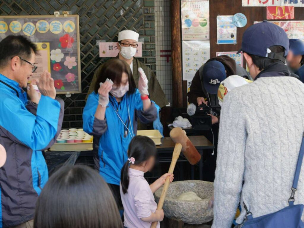 整理券を持って並ぶお子さんの合間に、お餅が固くならないように井上館長も餅つき。