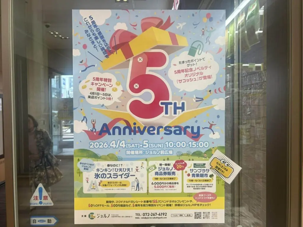 南海高野線堺東駅から歩いて約2分の場所にありますジョルノ前広場にて2026年4月4日(土)と5日(日)10:00~15:00『GIORNO 5th Anniversary』が開催されます。